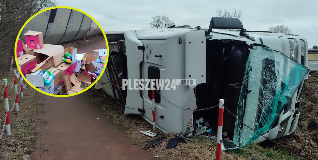56-letni mieszkaniec Gniezna, kierujac samochodem ciężarowym man z naczepą, jadąc w kierunku Pleszewa, stracił panowanie nad pojazdem. Zjechał do rowu uszkadzając bariery ochronne. Następnie pojazd przewrócił się na bok - mówi M. Kołaska z pleszewskiej policji.