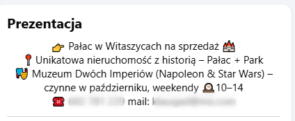 Oferta sprzedaży znajduje się nie tylko na tzw. "tablicy" Facebooka (czyli bieżących wiadomościach właściciela profilu), ale również w innym dziale - "Prezentacja". Tu dane kontaktowe wskazane są prawdopodobnie do właściciela .