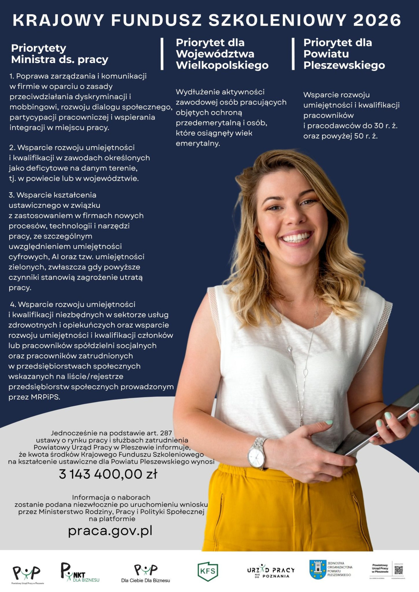 Zachęcamy do zapoznania się z priorytetami już teraz. Krajowy Fundusz Szkoleniowy to realna szansa na rozwój kompetencji i kwalifikacji pracowników oraz pracodawców z terenu powiatu pleszewskiego - zachęca dyrektor PUP w Pleszewie, Piotr Janiak.