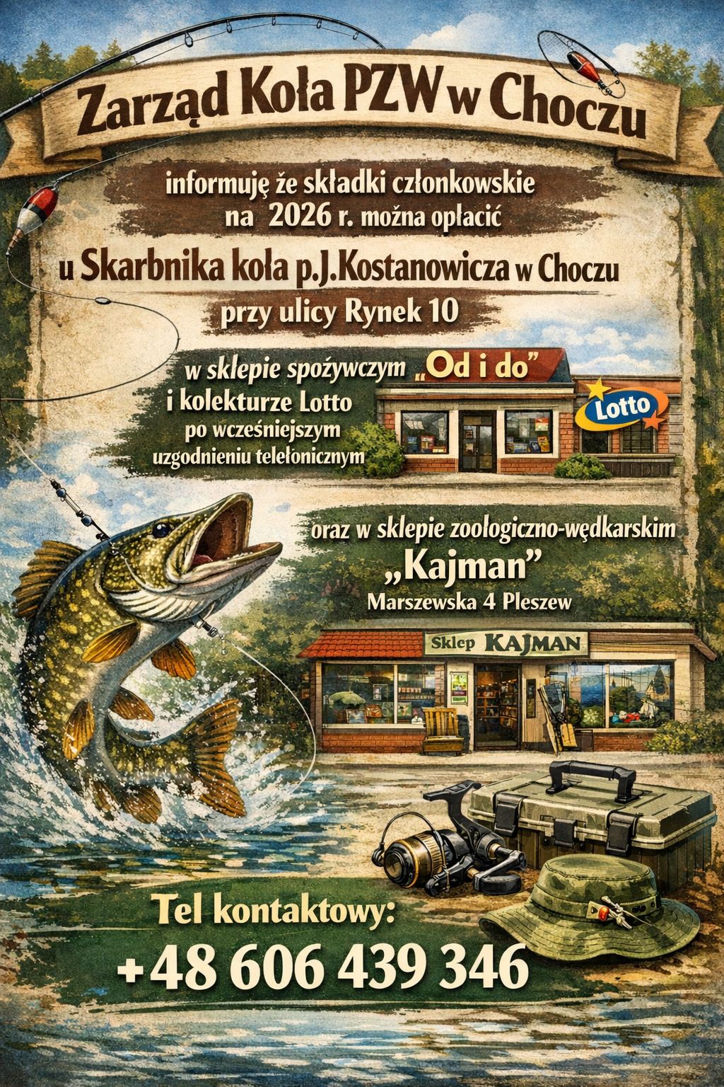 Zarząd Koła PZW w Choczu informuje, że składki członkowskie na 2026 rok można opłacić u Skarbnika Koła, p. J. Kostanowicza - w Choczu przy ulicy Rynek 10. Wpłaty przyjmowane są w sklepie spożywczym „Od i do” oraz w kolekturze Lotto, po wcześniejszym uzgodnieniu telefonicznym.