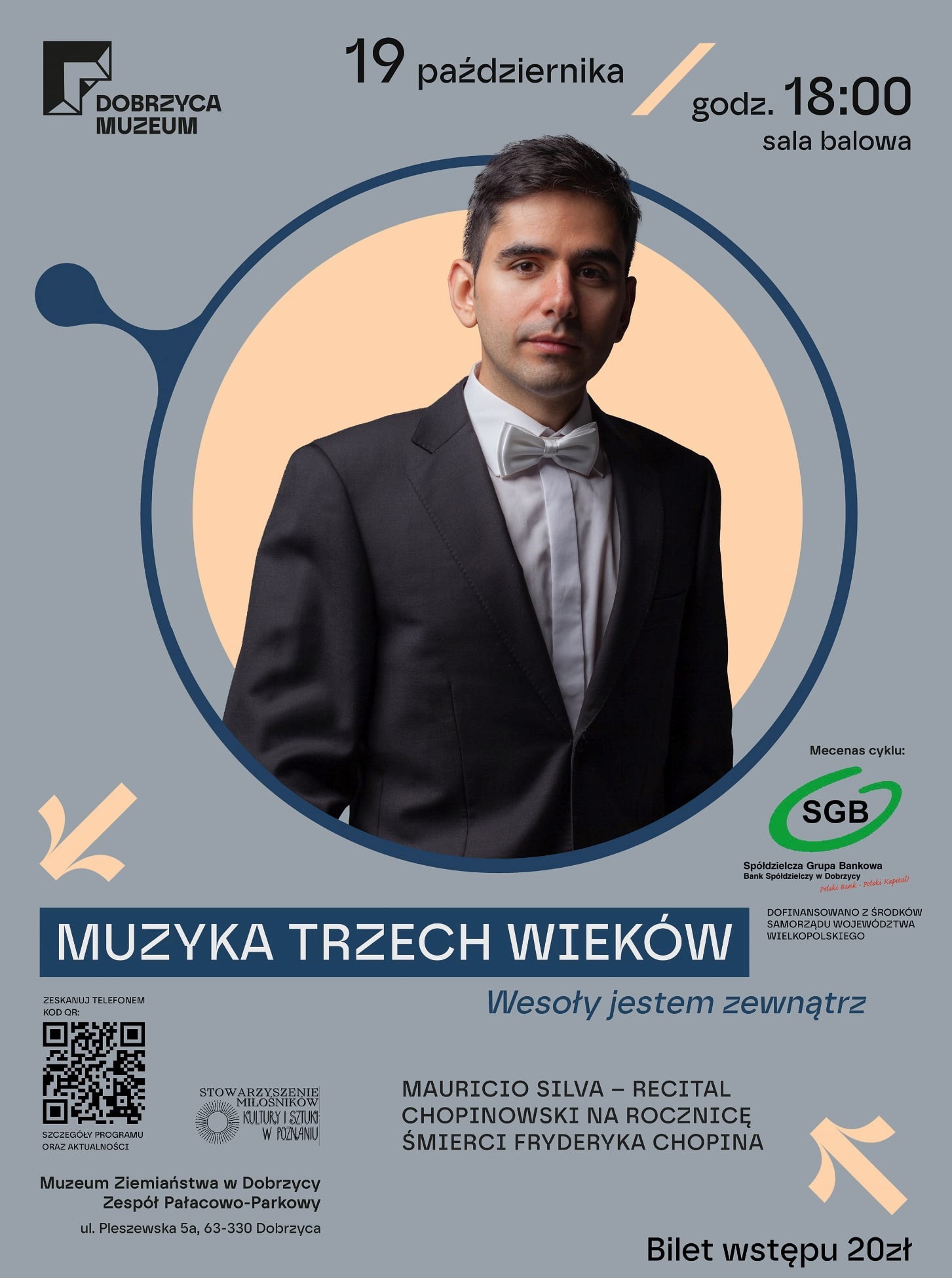 To będzie kolejna odsłona cyklu muzyczno-edukacyjnego ,,Muzyka Trzech Wieków’’, który realizowany jest przez Muzeum Ziemiaństwa w Dobrzycy. Koncert nosił będzie tytuł ,,Wesoły jestem zewnątrz’’, co odnosi się do słów Fryderyka Chopina, którego twórczość zaprezentuje pianista.