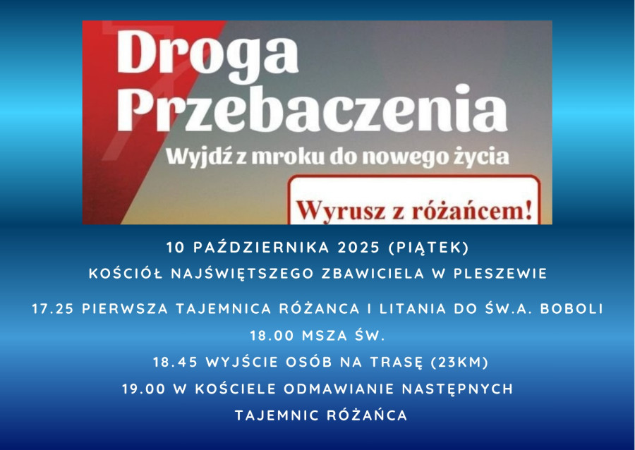Organizatorzy podkreślają, że „Droga Przebaczenia” to nie tylko pielgrzymka, ale przede wszystkim duchowa podróż w głąb siebie – szansa, by zostawić za sobą to, co trudne, i otworzyć się na nowe życie w wierze.