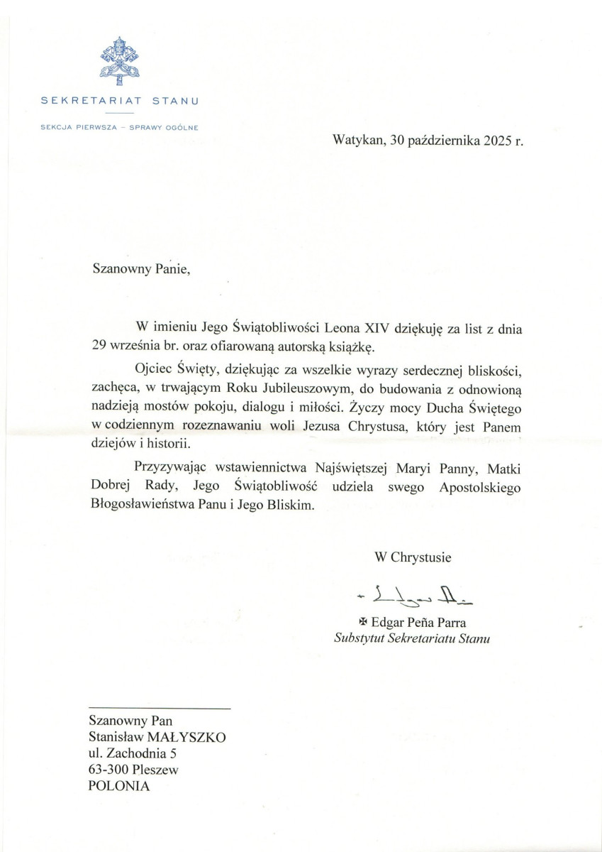 Autor publikacji Stanisław Małyszko poinformował, że otrzymał właśnie serdeczny list z Sekretariatu Stanu Stolicy Apostolskiej. Dokument został podpisany w imieniu Papieża przez arcybiskupa Edgara Penę Parrę, Substytuta Sekretariatu Stanu, często określanego jako „szef sztabu papieskiego”. To jedna z kluczowych postaci w administracji watykańskiej, co dodatkowo podkreśla rangę tego gestu.