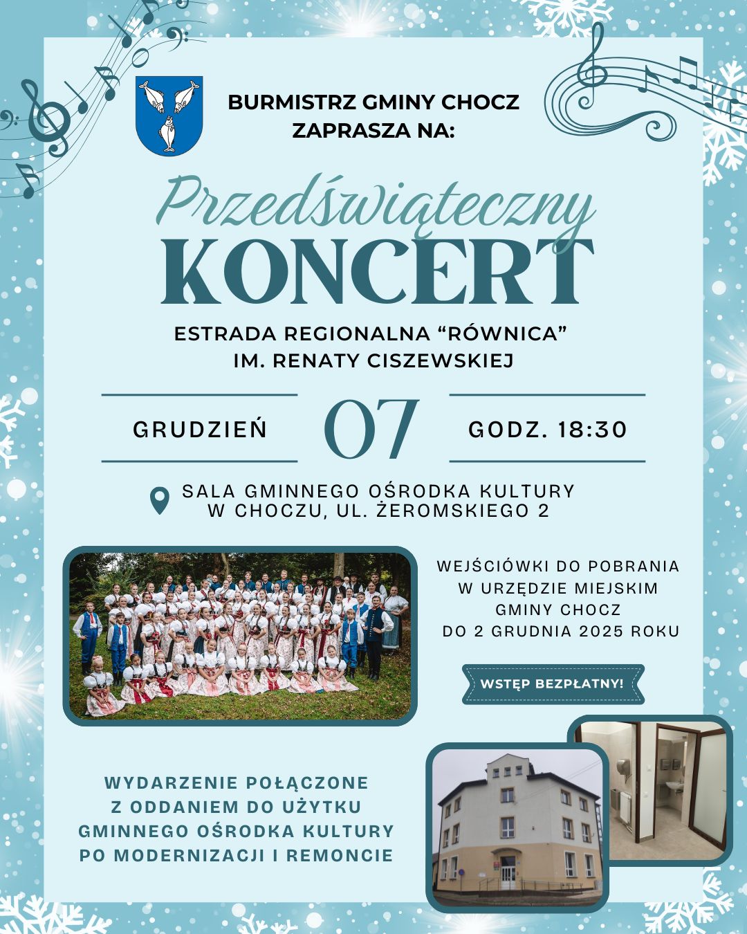 Kolejne wydarzenie to Przedświąteczny Koncert Estrady Regionalnej „Równica” im. Renaty Ciszewskiej, który odbędzie się 7 grudnia o godzinie 18:30 w sali Gminnego Ośrodka Kultury w Choczu przy ulicy Żeromskiego 2.