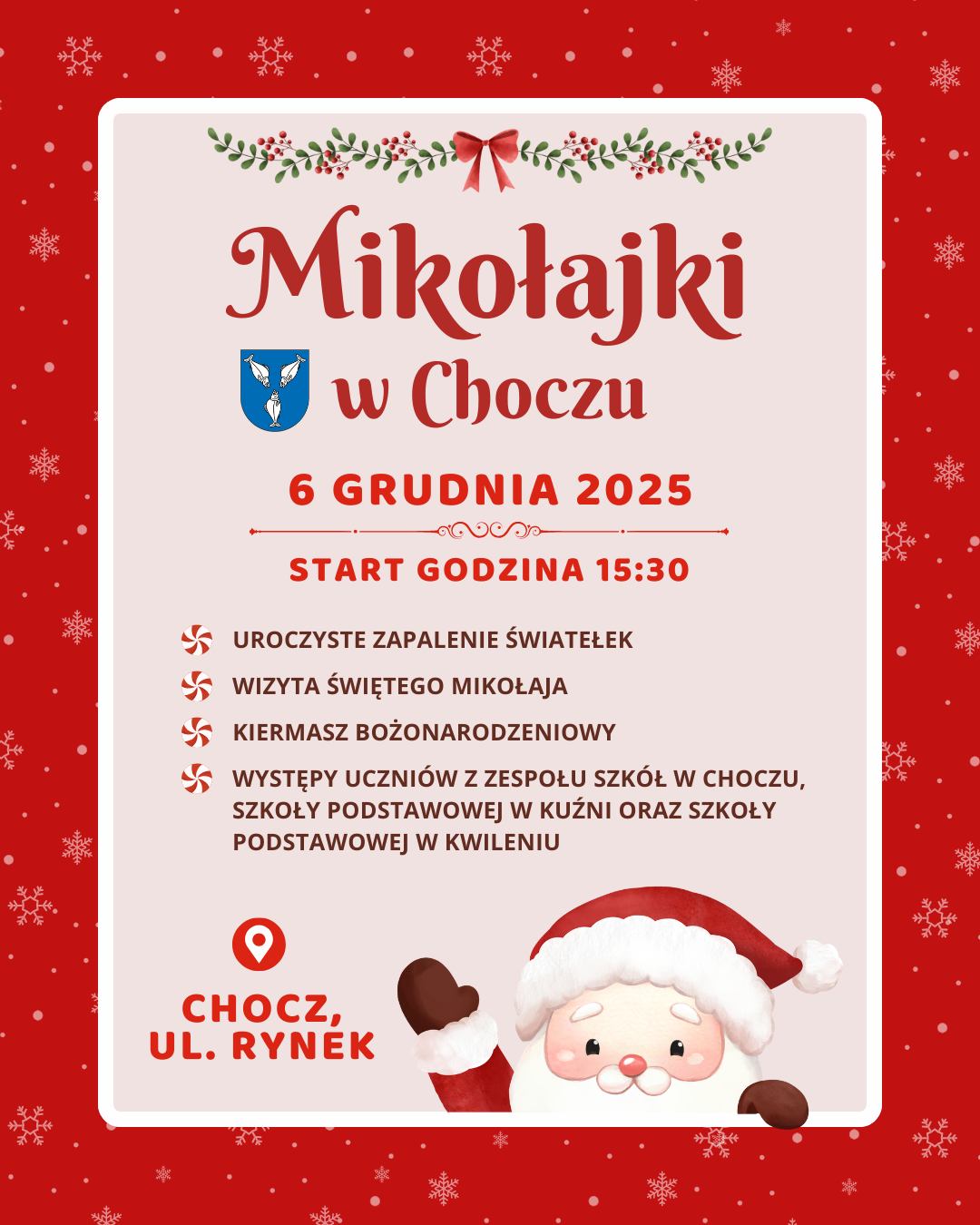Z kolei 6 grudnia 2025 roku na chockim rynku odbędą się Mikołajki w Choczu, których start zaplanowano na 15:30. W programie przewidziano: uroczyste zapalenie światełek, wizytę Świętego Mikołaja, kiermasz bożonarodzeniowy oraz występy uczniów z Zespołu Szkół w Choczu, Szkoły Podstawowej w Kuźni oraz Szkoły Podstawowej w Kwileniu.