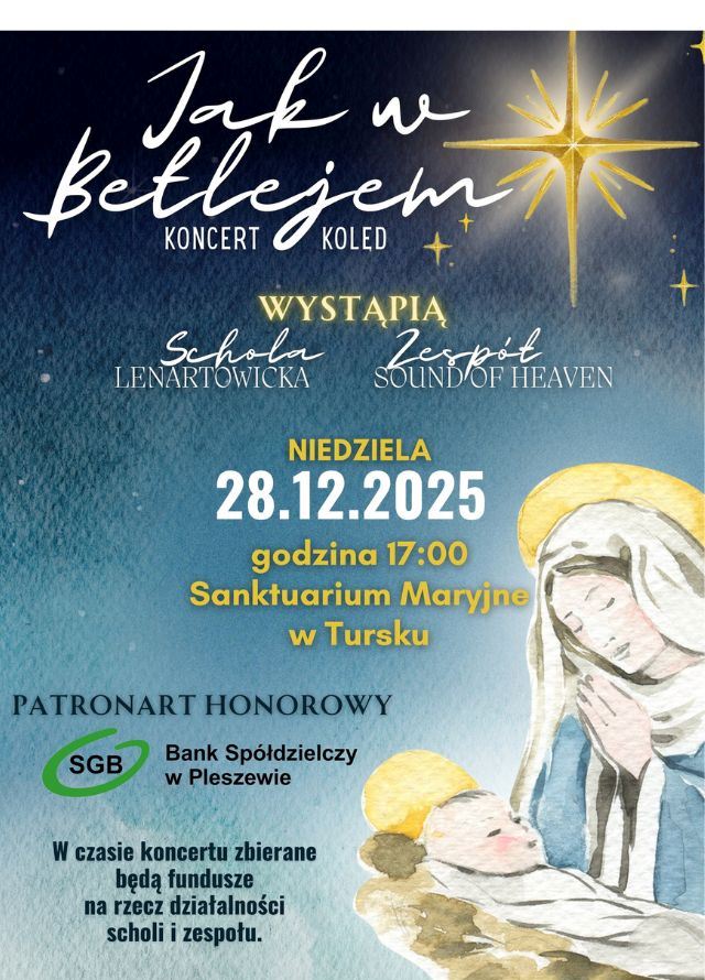 Drugim wydarzeniem objętym patronatem Banku Spółdzielczego, a pod patronatem medialnym Pleszew24.info, będzie koncert kolęd „Jak w Betlejem”, który odbędzie się tego samego dnia o godzinie 17.00 w Sanktuarium Maryjnym w Tursku. Przed publicznością wystąpią Schola Lenartowicka oraz zespół Sound of Heaven.