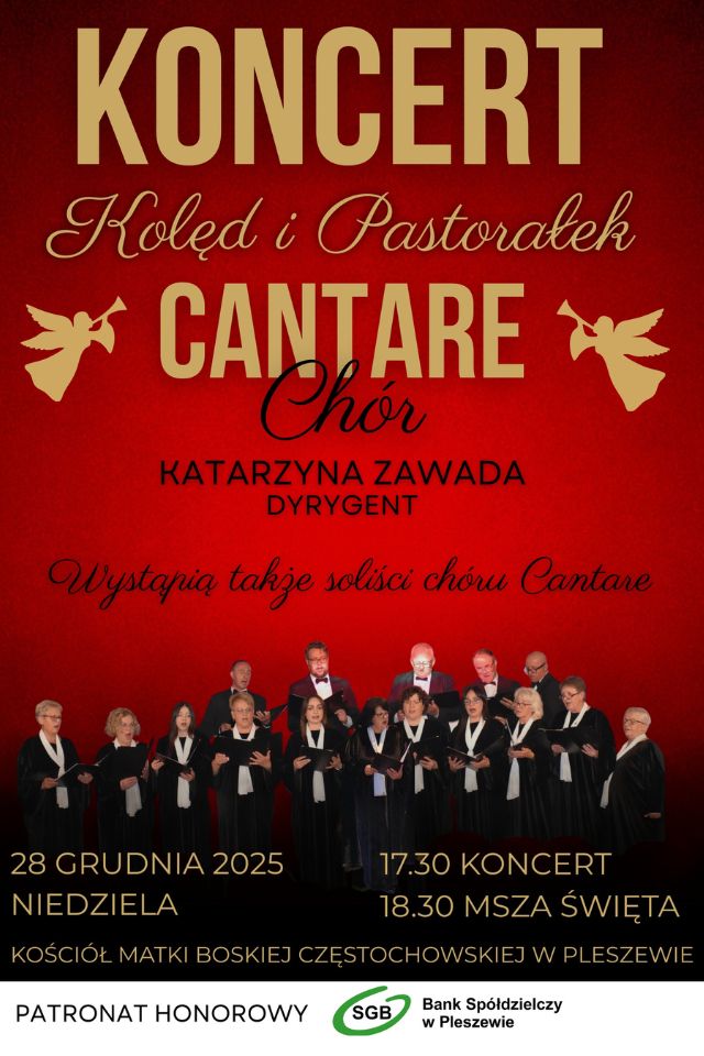 Pierwszym z wydarzeń będzie Koncert Kolęd i Pastorałek w wykonaniu chóru Cantare - dyrygent Katarzyna Zawada. Koncert odbędzie się w Kościele Matki Boskiej Częstochowskiej w Pleszewie w niedzielę, 28 grudnia. Początek koncertu zaplanowano na godzinę 17.30, a po nim, o 18.30, odprawiona zostanie uroczysta Msza Święta.
