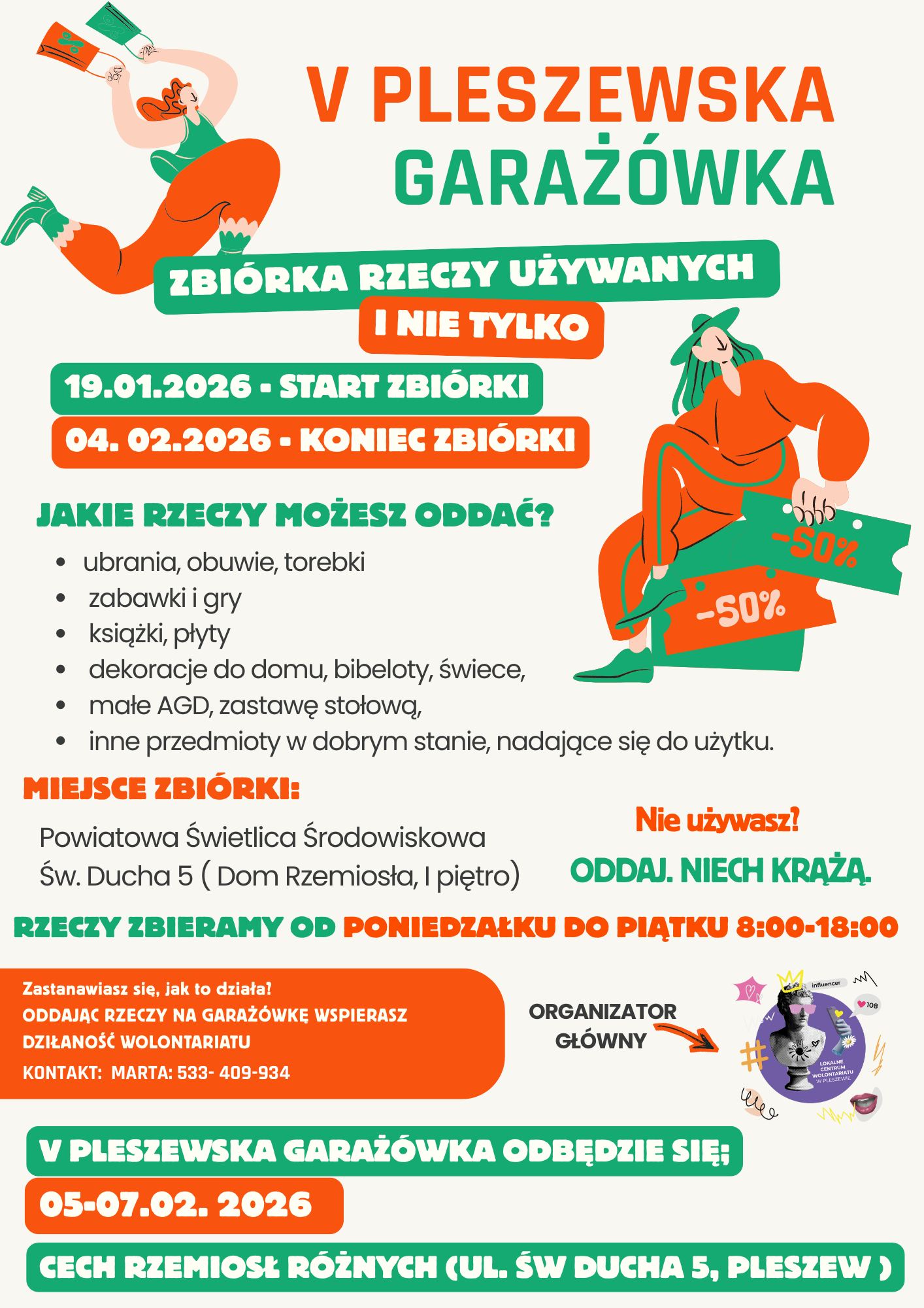 W Pleszewie odbędzie się piąta edycja Pleszewskiej Garażówki. Wydarzenie poprzedzi zbiórka rzeczy używanych oraz innych przedmiotów nadających się do dalszego użytku. Zbiórka rozpocznie się 19 stycznia 2026 roku i potrwa do 4 lutego 2026 roku. Rzeczy zbierane są od poniedziałku do piątku w godzinach 8:00–18:00. Zbiórka prowadzona jest w Powiatowej Świetlicy Środowiskowej przy ul. Św. Ducha 5 w Pleszewie, w Domu Rzemiosła na pierwszym piętrze.