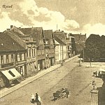 Oglądając naszą galerię, zwrócicie uwagę na charakterystyczne budynki stojące przed ratuszem od strony północnej. Nie w zewnętrznej linii rynku, lecz w jego środku. To dość rozbudowana forma podpiwniczonych jatek kupieckich, rzemieślniczych. Prawdopodobnie znajdowała się tu również karczma, o czym świadczą butelki znajdowane podczas prac ziemnych w tym obszarze. Budynki te zostały rozebrane w 1919 roku. Jeszcze przed II wojną światową na zachodzie rynku pojawił się dystrybutor paliwa.