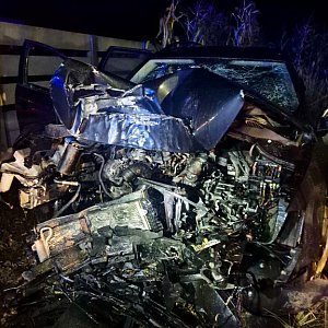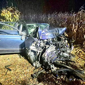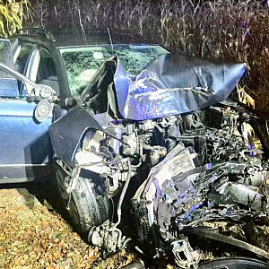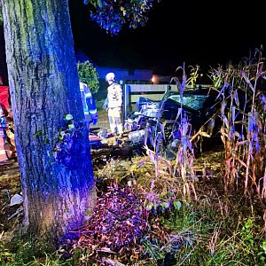 Zdarzenie ma miejsce przy drodze powiatowej, która obecnie (godzina 19.30) jest całkowicie zablokowana. Samochód osobowy, z nieznanych jeszcze przyczyn, uderzył w drzewo. Zniszczenia samochodu są olbrzymie, co wskazuje na dużą siłę zderzenia.