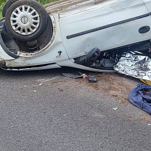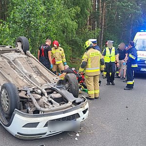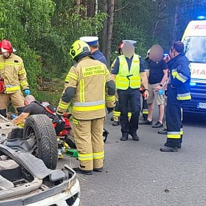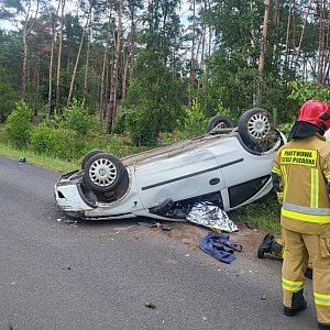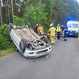 Samochód opel corsa dachował. W aucie podróżowały dwie osoby. Wstępne informacje mówiły, że na miejsce skierowano śmigłowiec Lotniczego Pogotowia Ratunkowego z Michałkowa. Jego udział ostatecznie nie był potrzebny.