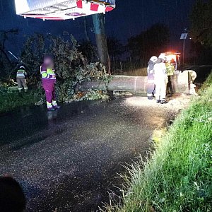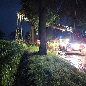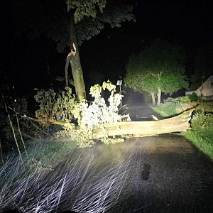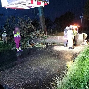 Drzewo było powalone na drogę powiatową w miejscowości Polskie Olędry. Dodatkowym utrudnienie strażakom sprawiło zawiśnięcie konarów na linkach wysokiego napięcia. Na miejsce przyjechało pogotowie energetyczne, które odcięło zasilanie i umożliwiło druhom dalsze działania.