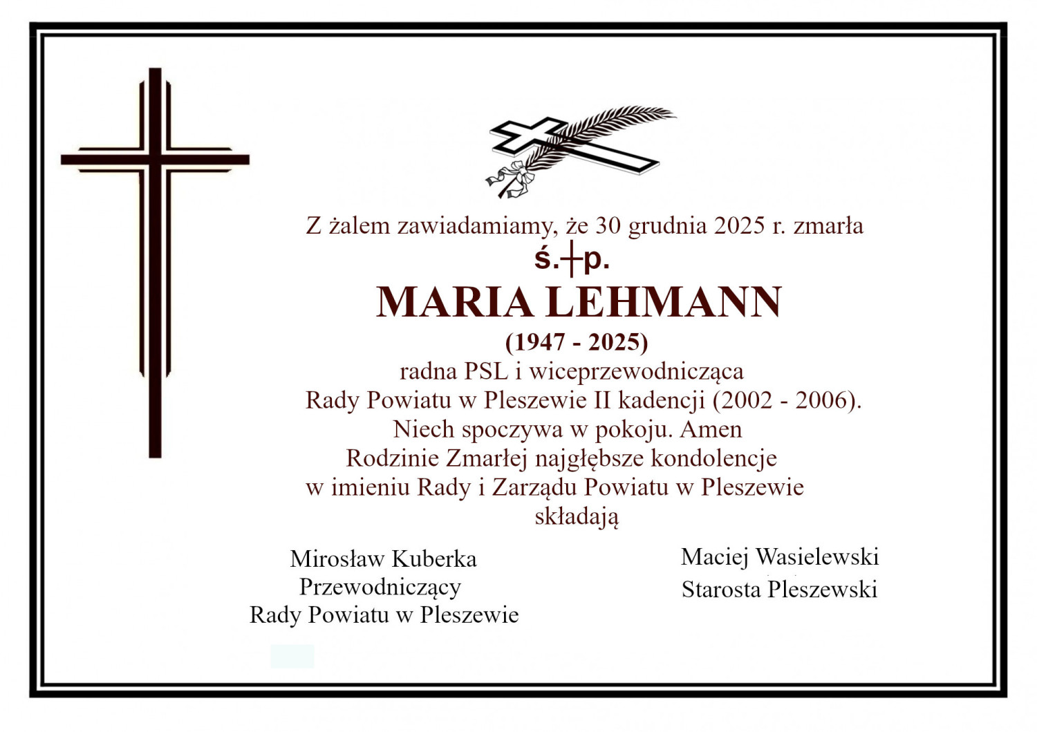 W opublikowanym oświadczeniu władze samorządu złożyły rodzinie Zmarłej wyrazy najgłębszego współczucia. Kondolencje w imieniu Rady i Zarządu Powiatu Pleszewskiego przekazali przewodniczący Rady Powiatu Mirosław Kuberka oraz starosta pleszewski Maciej Wasielewski.