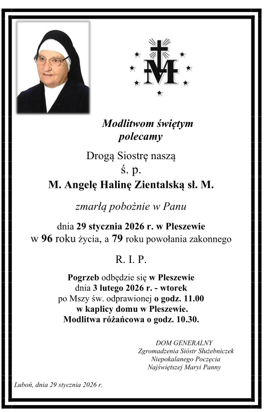 Z Rozdrażewa dnia 09 września 2010 roku S. Angela została skierowana do domu w Zaniemyślu gdzie pomagała w pracach domowych i opiekowała się starszymi i schorowanymi Siostrami. Z biegiem czasu siły malały, stan zdrowia się pogarszał. 03 stycznia 2019 roku stan zdrowia tak się pogorszył, że została przywieziona do Pleszewa do Domu Prowincjalnego i umieszczona w Zakładzie Pielęgnacyjno-Opiekuńczym w naszym Domu. Tutaj była pod fachową opieką personelu i troską Sióstr. Odeszła do Domu Ojca 29 stycznia 2026 r. Ave Maryja.