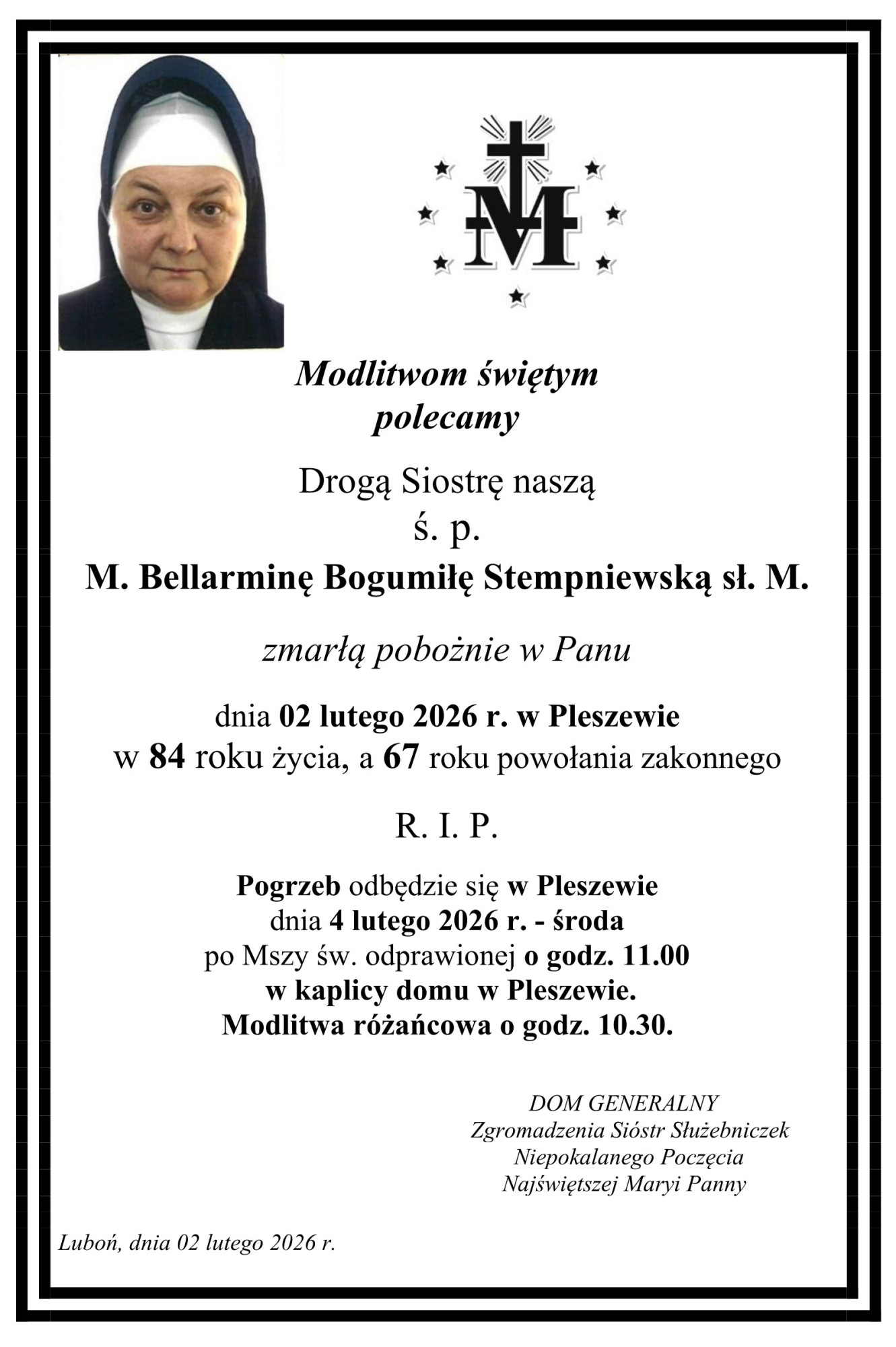 W grudniu 2022 roku ze względu na stan zdrowia zostaje przewieziona do Domu Prowincjalnego w Pleszewie i zamieszkuje z chorymi Siostrami w części przystosowanej dla chorych pod troskliwą opieką Sióstr Pielęgniarek, całej Wspólnoty i Ks. Kapelana. W połowie stycznia br. stan zdrowia zaczął gwałtownie się pogarszać. Słabła bardzo szybko, przestała chodzić, jeść, nawet nie mogła połykać wody. Otoczona modlitwą Sióstr, zaopatrzona sakramentami świętymi, odeszła do Domu Ojca 2 lutego 2026 r. o godz. 3.40.