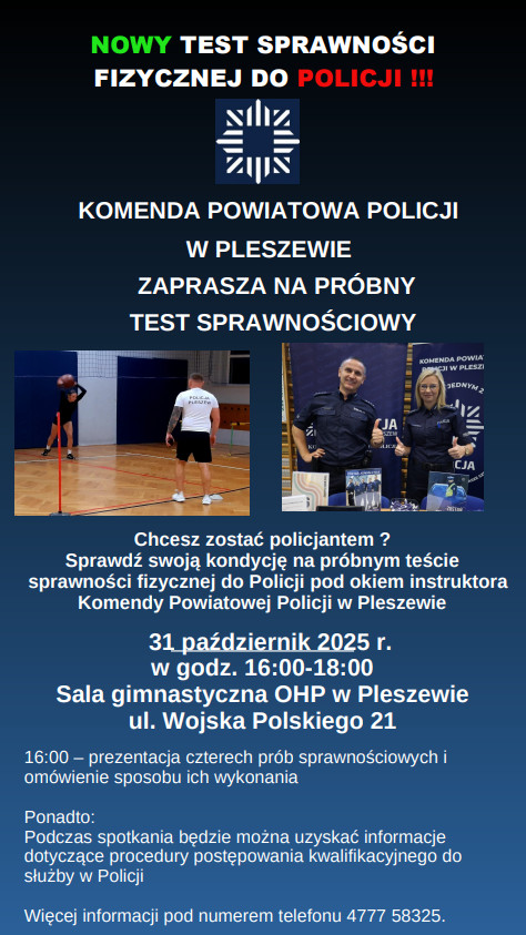 W piątek, 31 października 2025 roku, w godzinach od 16.00 do 18.00, policjanci zapraszają wszystkich chętnych na otwarty trening testu sprawności fizycznej, który odbędzie się w sali gimnastycznej OHP przy ul. Wojska Polskiego w Pleszewie.