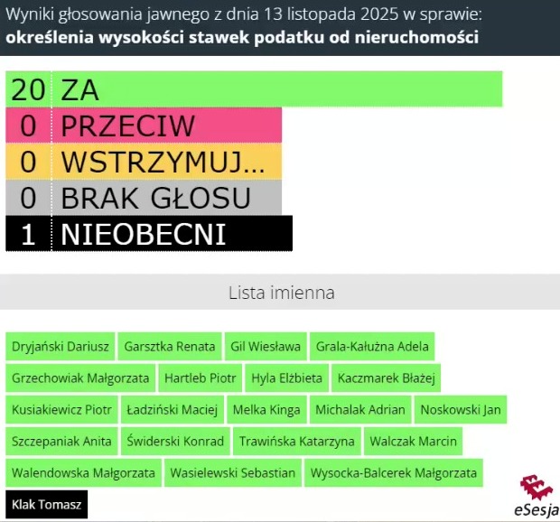 Jak można się można było spodziewać, żaden z obecnych na sesji radnych nie był przeciwny projektom przedłożonym przez burmistrza (nie było Tomasza Klaka). Bez względu na reprezentowane ugrupowanie, wszyscy poparli nowe stawki, a wśród nich podwyżki danin lokalnych: podatków od nieruchomości dla osób prywatnych i przedsiębiorców oraz opłat za odbiór i gospodarowanie odpadami.