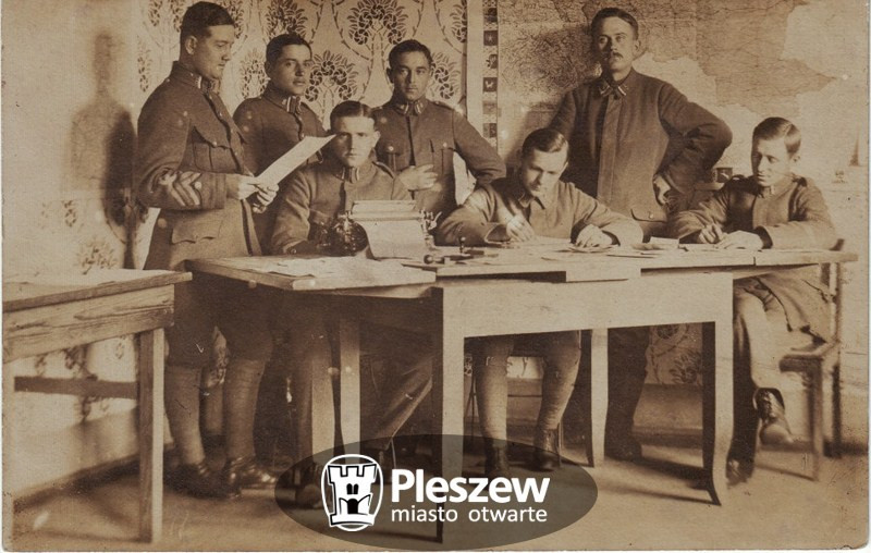 W pierwszej fazie Powstania Wielkopolskiego walczący umundurowani byli w sorty armii pruskiej, zastępując niemieckie oznaczenia kokardami i opaskami w barwach biało – czerwonych. W styczniu 1919 roku rozpoczęto organizację regularnej Armii Wielkopolskiej. Rozkazem z dnia 7 stycznia 1919 roku wydzielono siedem okręgów wojskowych, a Pleszew przyporządkowano do okręgu VI wraz ze Śremem, Jarocinem, Gostyniem, Rawiczem, Krotoszynem, Koźminem. Rozkazem z 8 stycznia nakazano m.in. umieszczenie na czapkach orzełka srebrnego o wymiarach 3,5 cm x 3,5 cm oraz biało – czerwonej kokardy, a na kołnierzach bluz mundurowych i płaszczy pionowych pasków w barwach narodowych. Z czasem wprowadzano także charakterystyczne wysokie rogatywki – jak u żołnierzy na zdjęciu.