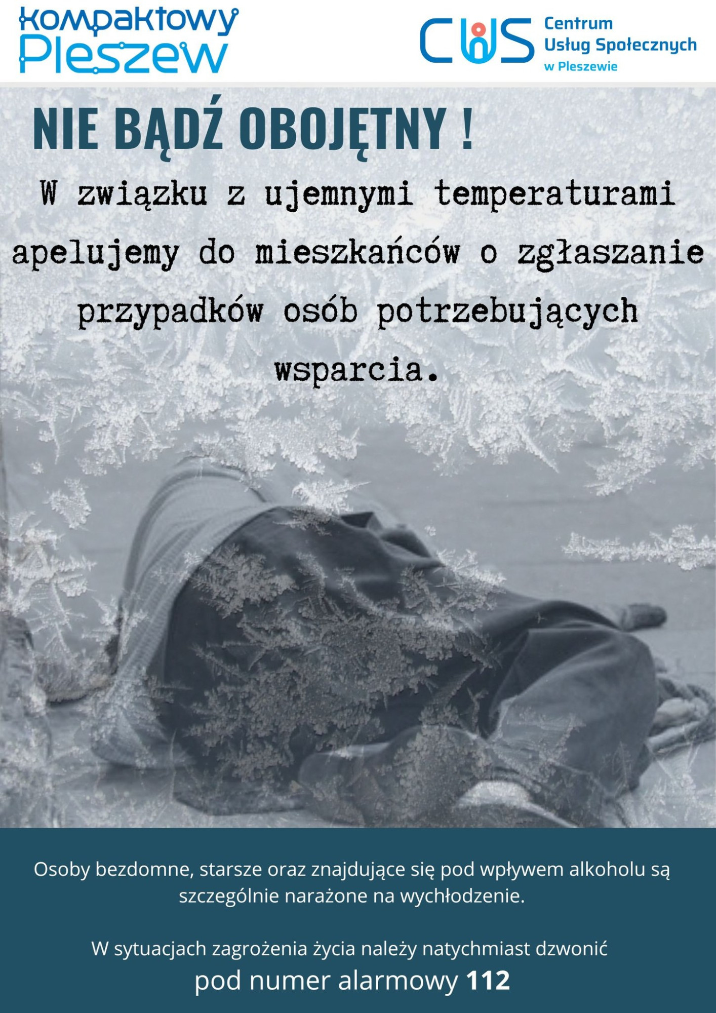Zima to trudny czas dla osób bezdomnych. Niska temperatura, śnieg i mróz mogą stanowić zagrożenie dla ich życia i zdrowia. Jeżeli zauważysz osobę potrzebująca pomocy: zgłoś to! - apelują w social mediach władze Miasta i Gminy Pleszew