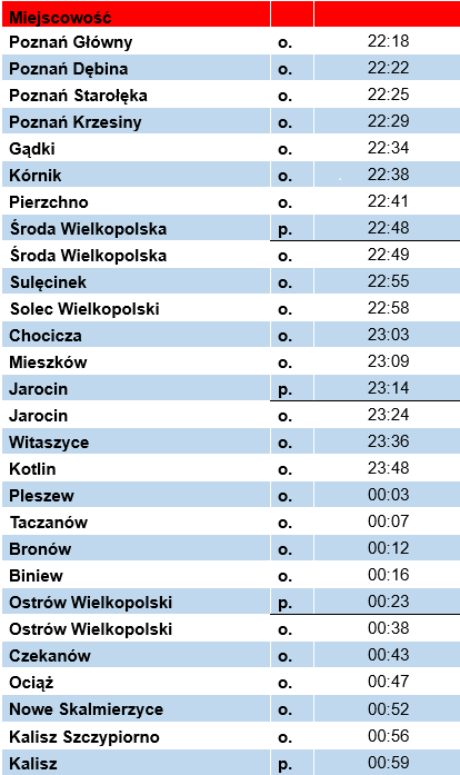 Chodzi o pociąg Zmiany w kursowaniu pociągu 77592 relacji Poznań Główny – Kalisz w dniu 24.02.2026, który z Poznania wyruszy o godzinie 22:18.