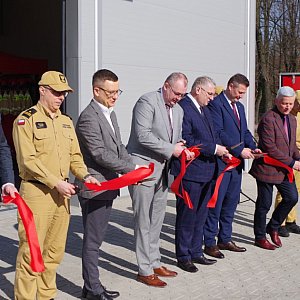 Po zakończeniu odprawy, zaproszeni goście przeszli przed nowopowstały budynek, gdzie nastąpiło przecięcie wstęgi i oficjalne przekazanie do użytku. Obiekt został poświęcony przez kapelana strażaków ks. Tadeusza Pietrzaka.