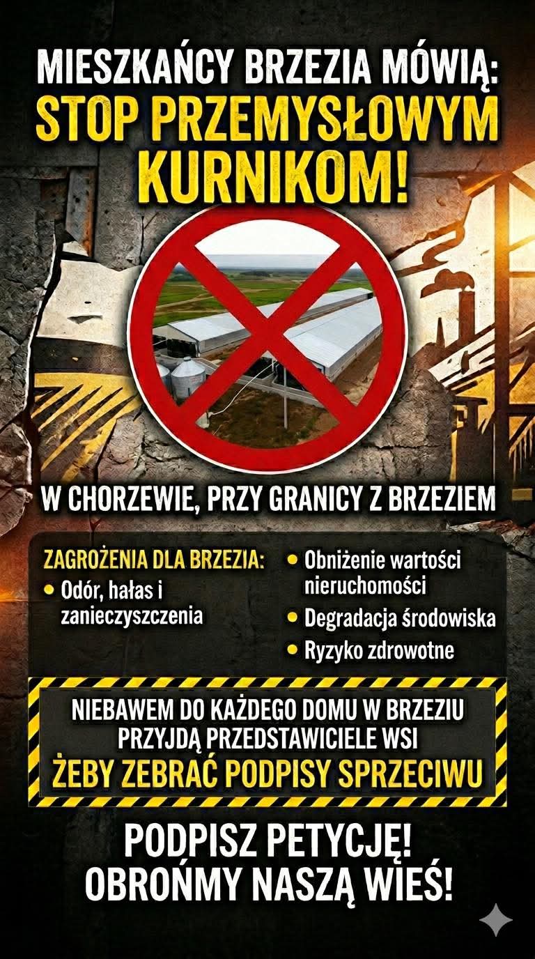 Drodzy Mieszkańcy. Jesteśmy bezpośrednio zagrożeni inwestycją planowaną w Chorzewie, tuż przy granicy z Brzeziem. Mają tam powstać wielkoprzemysłowe kurniki. Tego typu fermy niosą ze sobą poważne konsekwencje dla naszej miejscowości: smród i odór - zanieczyszczenie powietrza, które wpłynie na jakość życia wszystkich mieszkańców. Hałas i ruch - wzmożony ruch ciężarówek, maszyn, a także hałas wentylatorów pracujących 24/7. Spadek wartości nieruchomości - domy w pobliżu takich ferm drastycznie tracą na wartości. Zagrożenie dla środowiska i zdrowia - ryzyko zanieczyszczenia wód i gleby - pisze radny Michalak.