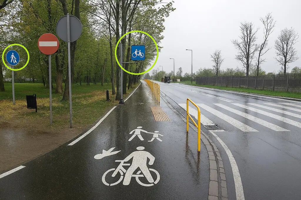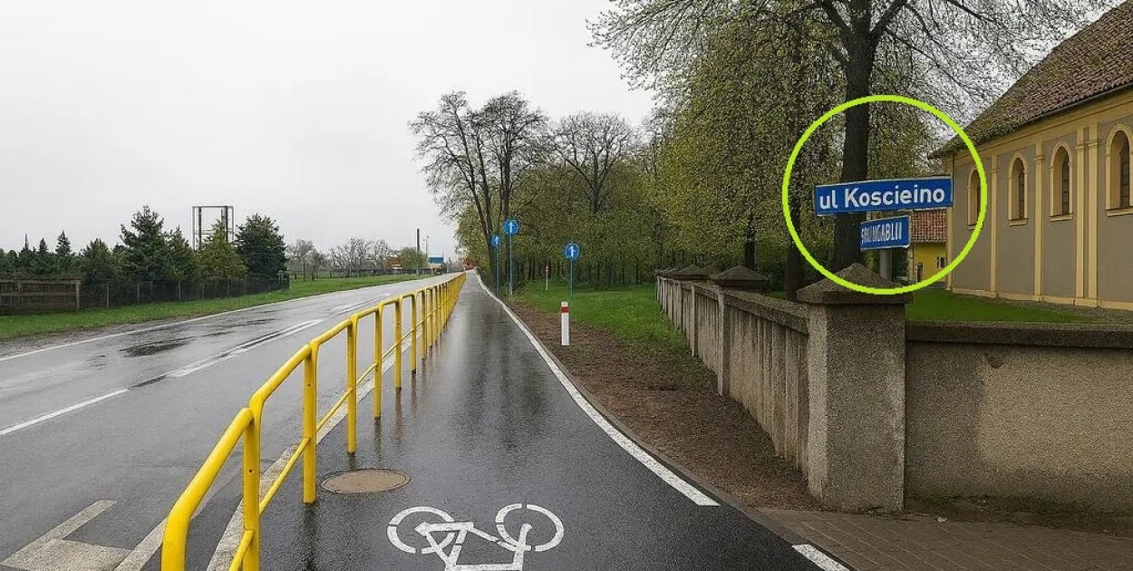 To nie jedyne nieścisłości. Na jednym ze zdjęć widoczny był znak drogowy niewystępujący w Polsce – kwadratowy symbol, który prawdopodobnie miał oznaczać ścieżkę rowerową. Z kolei przy wejściu do parku pojawił się trudny do zinterpretowania okrągły znak, przypominający postać człowieka trzymającego coś na kształt reklamówki.