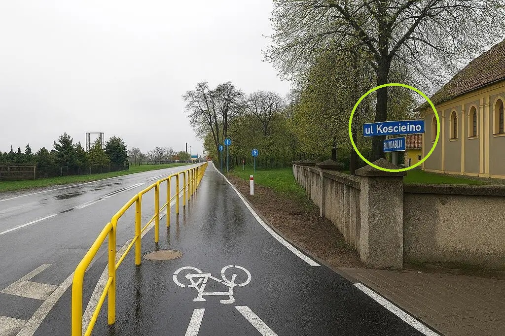 Efekty ingerencji sztucznej inteligencji okazały się łatwe do zauważenia. Ulica Kościelna w Kuczkowie została na zdjęciach przemianowana na „Koscieino”. Nazwę zmieniła też ulica Pleszewska (tabliczka poniżej) - szyk liter wskazywał, że z pewnością słowo nie było w języku polskim, ani prawdopodobnie w żadnym innym.