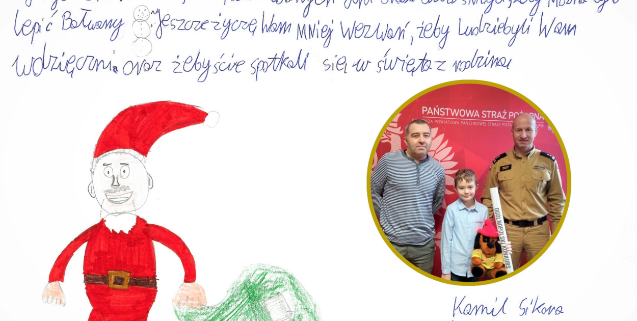 Wśród ponad setki przygotowanych kartek, znalazły się również życzenia dla pleszewskich strażaków. Przygotował je właśnie Kamil Sikora, który w zamian, wraz z tatą, został zaproszony do pleszewskiej komendy Państwowej Straży Pożarnej.
