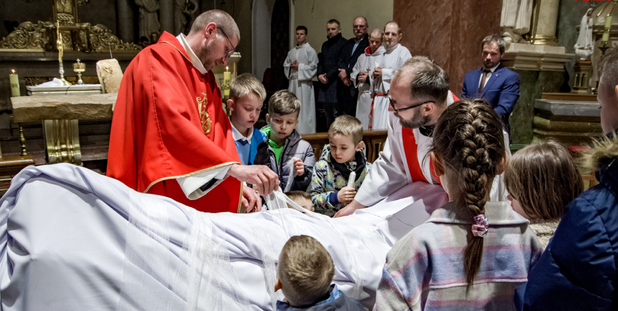 Przed symbolicznym przeniesieniem figury Jezusa do grobu, została ona owinięta w woal, który przedtem przykrywał krzyż. Dzieci natomiast zajęły się bandażowaniem postaci Chrystusa, co było poruszającą, a nawet wstrząsającą sceną.
