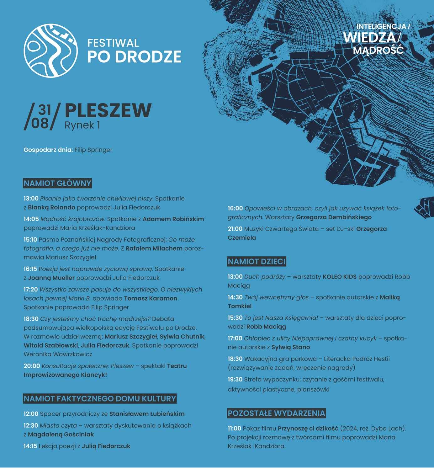 Na pleszewskim Rynku oprócz Mariusza Szczygła i Filipa Springera pojawi się wiele ciekawych osób, m.in. kulturoznawczyni, pisarka, feministka Sylwia Chutnik, dziennikarz, pisarz, reportażysta Witold Szabłowski czy też Julia Fiedorczuk. Wśród prelegentów są profesjonaliści z różnych dziedzin kultury, sztuki, literatury, ekologii.