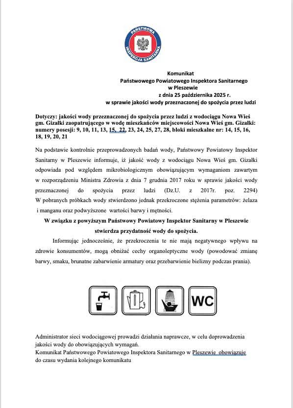 Na podstawie kontrolnie przeprowadzonych badań wody, Państwowy Powiatowy Inspektor Sanitarny w Pleszewie informuje, iż jakość wody z wodociągu Nowa Wieś gm. Gizałki odpowiada pod względem mikrobiologicznym obowiązującym wymaganiom zawartym w rozporządzeniu Ministra Zdrowia z dnia 7 grudnia 2017 roku w sprawie jakości wody przeznaczonej do spożycia przez ludzi (Dz.U. z 2017r. poz. 2294) W pobranych próbkach wody stwierdzono jednak przekroczone stężenia parametrów: żelaza i manganu oraz podwyższone wartości barwy i mętności.