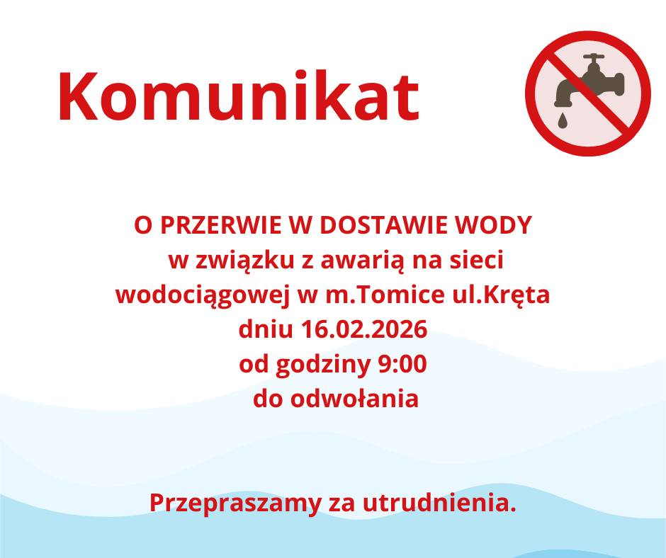 O przerwie w dostawie wody w związku z awarią na sieci wodociągowej w m. Tomice ul. Kręta dnia 16.02.2026 od godziny 9:00 do odwołania. Przepraszamy za utrudnienia.- czytam w komunikacie.