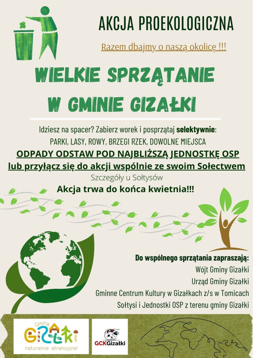 Do wspólnego sprzątania zapraszają Wójt Gminy Gizałki, Urząd Gminy Gizałki, Gminne Centrum Kultury w Gizałkach z siedzibą w Tomicach, a także sołtysi i jednostki OSP z terenu gminy.