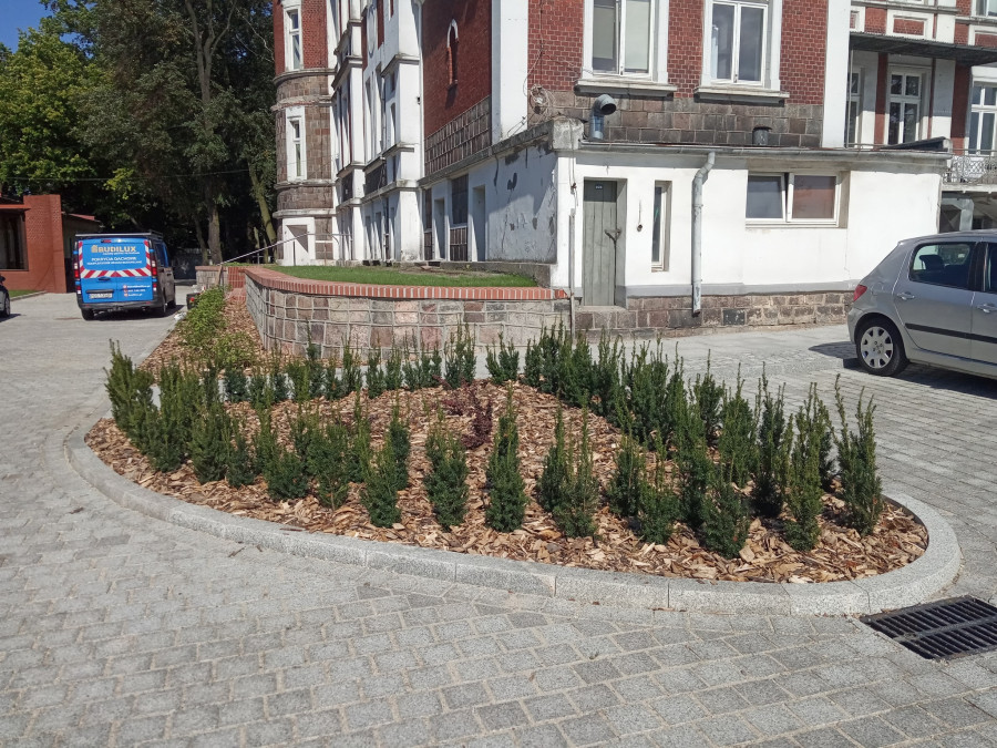 Drugim etapem była poprawa funkcjonalności i estetyki terenu wokół DPS. Powstały nowe drogi wewnętrzne i parking z kostki granitowej, a dojścia i chodniki wykonano z płyt granitowych płomieniowanych. Odnowiono mur kamienny i schody z cegły klinkierowej, wykonano kolektor deszczowy oraz przeprowadzono nasadzenia drzew i krzewów. Uzupełnieniem prac stały się elementy małej architektury – m.in. ławki i kosze.