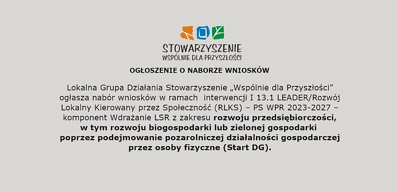 Lokalna Grupa Działania Stowarzyszenie „Wspólnie dla Przyszłości” ogłasza nabór wniosków w ramach interwencji I 13.1 LEADER/Rozwój Lokalny Kierowany przez Społeczność (RLKS) – PS WPR 2023-2027 – komponent Wdrażanie LSR z zakresu rozwoju przedsiębiorczości, w tym rozwoju biogospodarki lub zielonej gospodarki poprzez podejmowanie pozarolniczej działalności gospodarczej przez osoby fizyczne (Start DG)