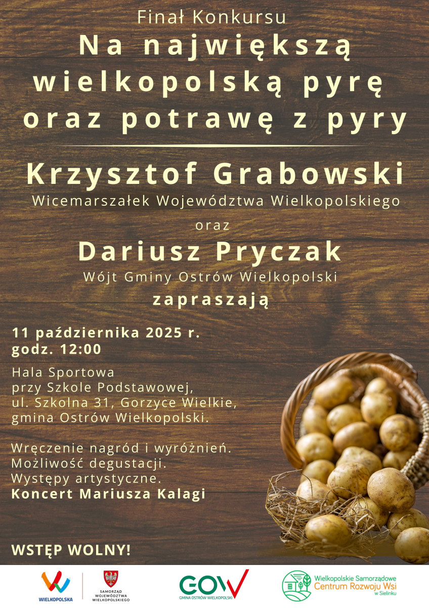 Samorząd Województwa Wielkopolskiego już po raz kolejny organizuje finał Konkursu „Na największą wielkopolską pyrę oraz potrawę z pyry”. Tym razem ziemniaczaną stolicą Wielkopolski staną się Gorzyce Wielkie w gminie Ostrów Wielkopolski, gdzie 11 października w Hali Sportowej przy Szkole Podstawowej przy ul. Szkolnej 31 odbędzie się degustacja potraw oraz oficjalne ważenie pyr gigantów.